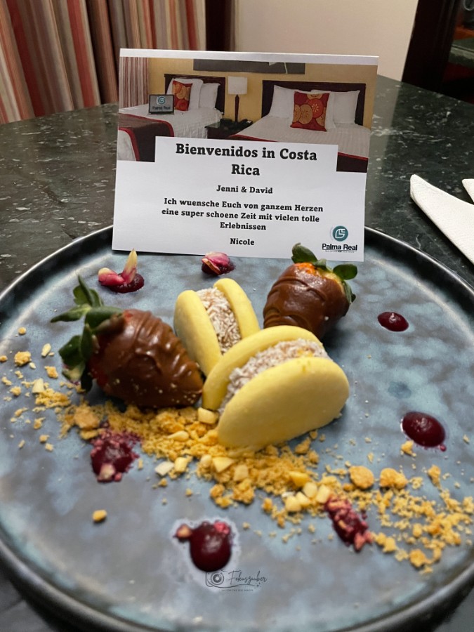 Nach einem entspannten Direktflug von Zürich nach San Jose wurden wir vom Privattransfer des Hotels Palma Real abgeholt. Der äusserst zuvorkommende Fahrer beantwortete uns die ersten wichtigen Fragen zu Costa Rica und gab uns einige sehr interessante Tipps zur bevorstehenden Mietwagenreise. Angekommen im Hotel Palma Real erwartete uns bereits ein Willkommensgruss im Zimmer. Beim Abendessen konnten wir unsere Organisatorin kennen lernen und erhielten die Reiseunterlagen für die kommenden 2 Wochen.